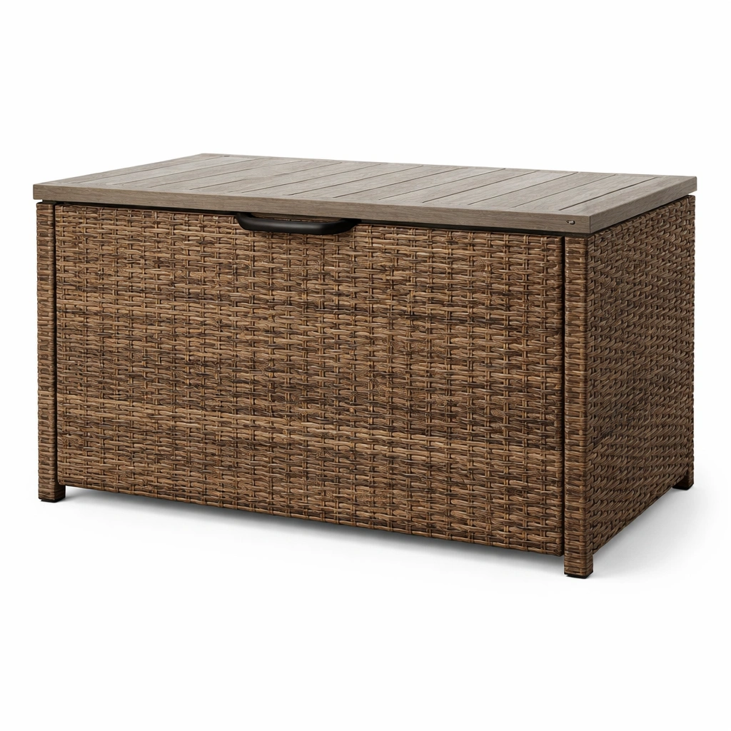 Arcón de almacenamiento para jardín de resina marrón con textura trenzada 117x55x62 cm