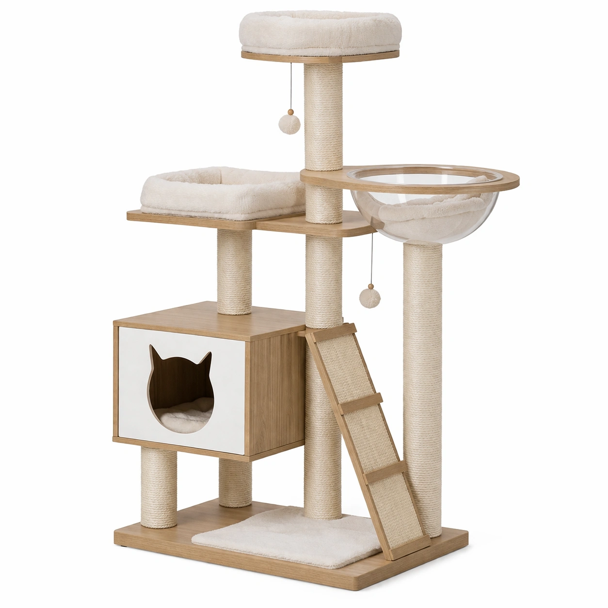 Árbol trepador para gatos, diseñado con estructura de MDF, incluye un tazón de descanso en acrílico transparente y una caseta. Las plataformas están cubiertas de tela de felpa beige. Cuenta con postes envueltos en cuerda de sisal, una rampa de acceso y juguetes colgantes.